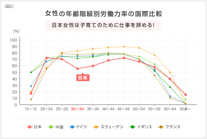 図2は女性の年代別労働力の国際比較です。M字カーブといって、先進諸国の中で日本と韓国だけが子育て世代である30~34歳で女性の労働力が低下します。北欧では子育てのためにリタイアすることはありません。それはひとえに社会的なインフラが整備されているからです。日本もイクメン世代の人たちが各界の幹部になってくると、状況は変わってくるだろうと期待されます。