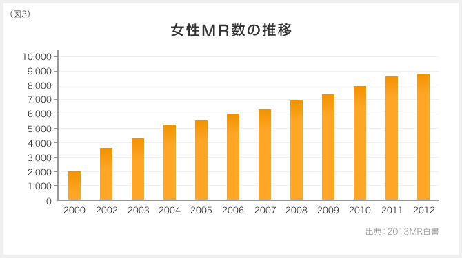 私が勤務医だった時代はMRさんはほとんどが男性で、私の勤務病院には女性MRさんは1人しか訪問されませんでした。大変素敵な方で気が合い、そのMRさんが来るのがとても楽しみでした。お互い若かったから女性としての生き方について話し合ったり、親密なよい交流がありました。その後、女性MRさんの人数は年々増加してきています(図3)。大変よいことだと思っています。