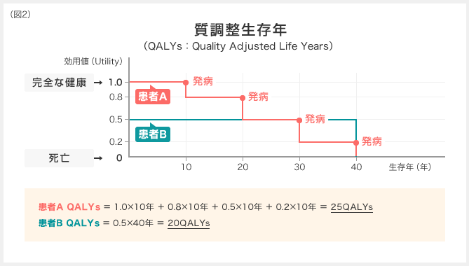 図2に、2人の患者さんの40年間の過ごし方がグラフ化されています。横軸は生存年です。縦軸はQOLを数値化した「効用値」です。効用値1が完全な健康を表し、効用値0が死亡を表しています。