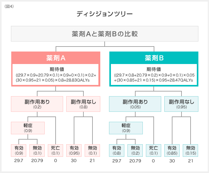 ディシジョンツリーは急性疾患の代表モデルとして使われています。治療開始から予後までの流れを表すツリーを作成し、費用と効果を推計するものです。薬剤Aを投薬して副作用が発生したが、軽症で最終的には有効だったため29.7QALYsだった。従って医療費はいくらだ、というように推計します。