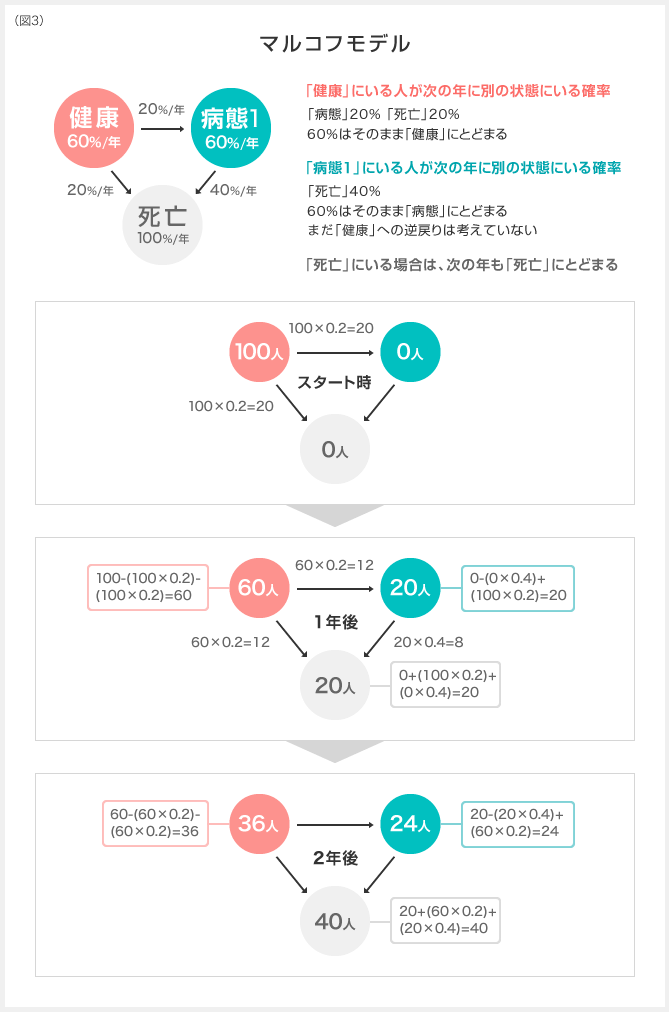 たとえば健康な方は毎年20%が病気になり、病気の人の40%は毎年死亡する、と設定することで散らばり具合を計算し、それを元に長期的な費用やQALYを推計します。