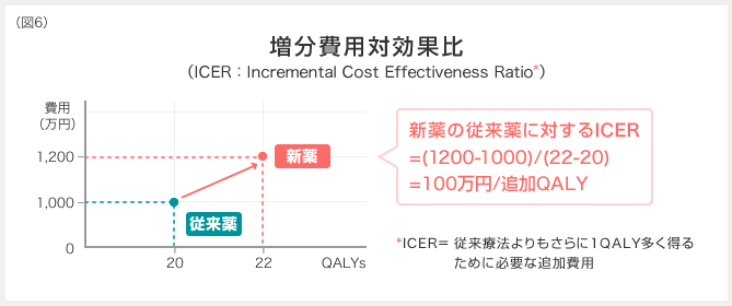 たとえば、従来薬が20 QALYsで1000万円、新薬が22 QALYsで1200万円だったとすると、新薬は従来薬より2QALYsを延長するものの200万円余計にかかります。1QALYは100万円ですから、この新薬のICERは100万円ということになります(図6)。